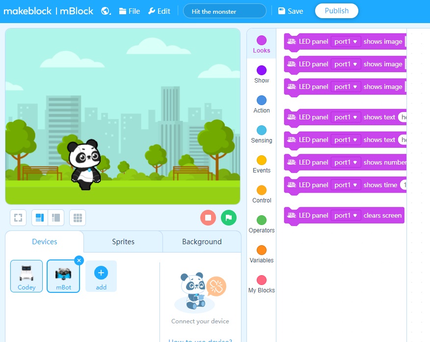 Then you drag and drop code (the color block) into Program area to create motion, sound, calculation, logic to control the characters interaction.